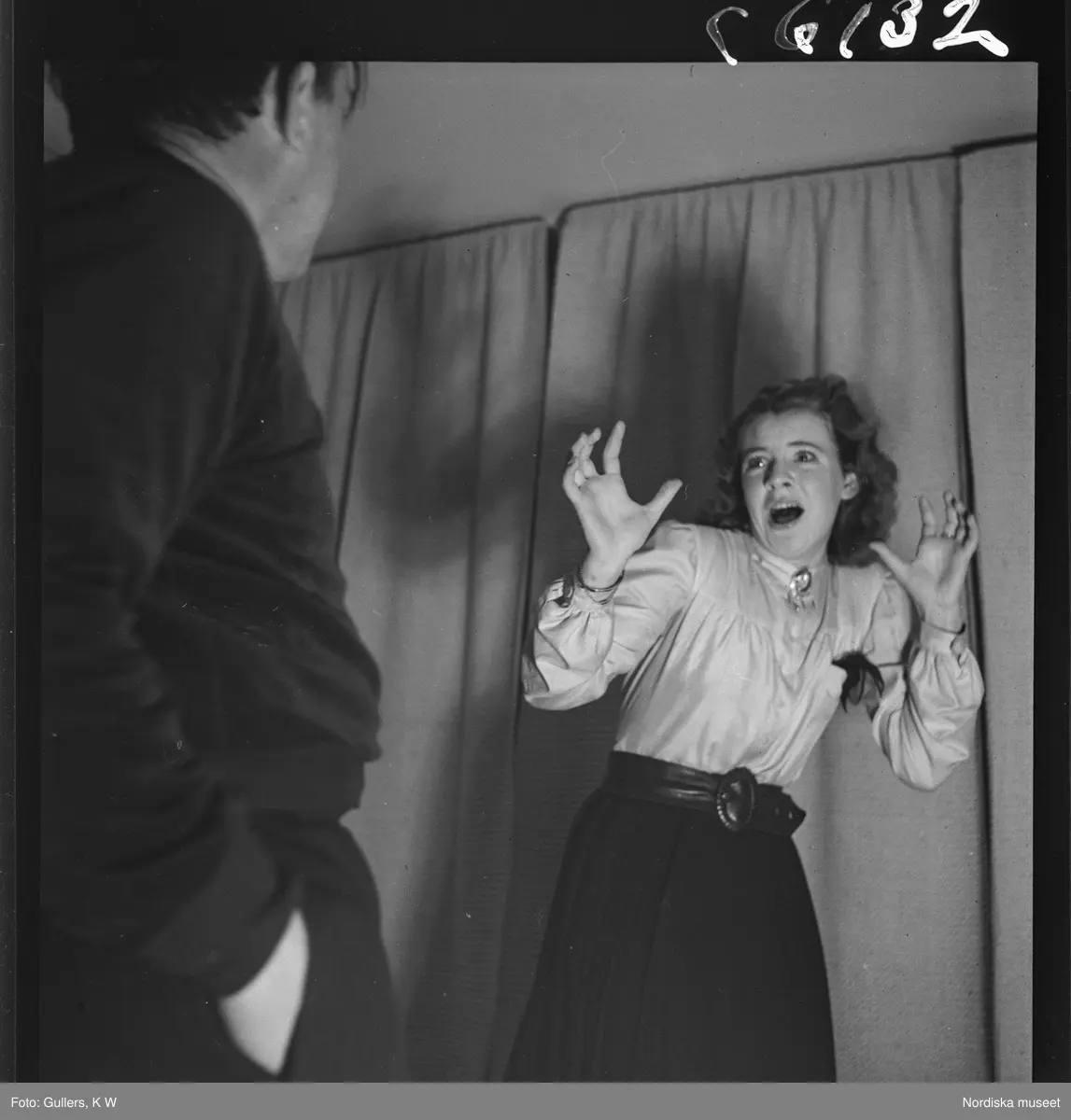 505 Wityansky Teaterskola för Allers. Elever repeterar. En ung kvinna spelar skräckslagen.