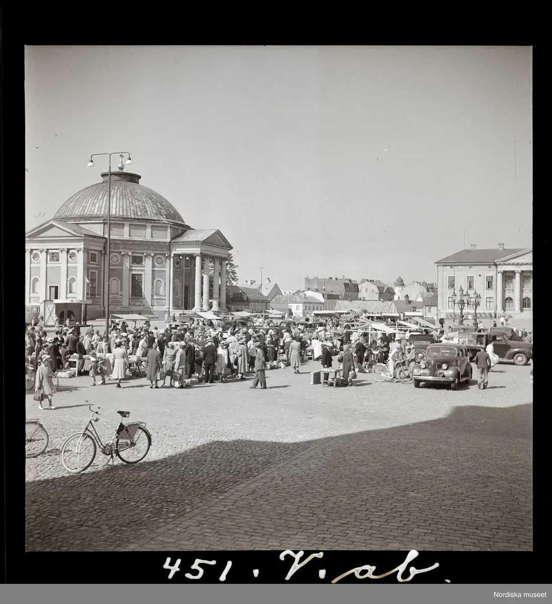 Titel: Handel på Stortorget med Trefaldighetskyrkan, Karlskrona.