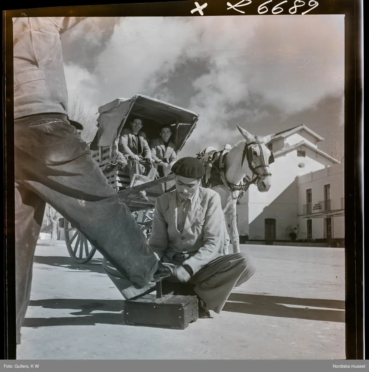 568 F. Stieg Trenter, Torremolinos. Skoputsare i arbete på gatan. Bakom passerar en kärra dragen av åsna/häst.