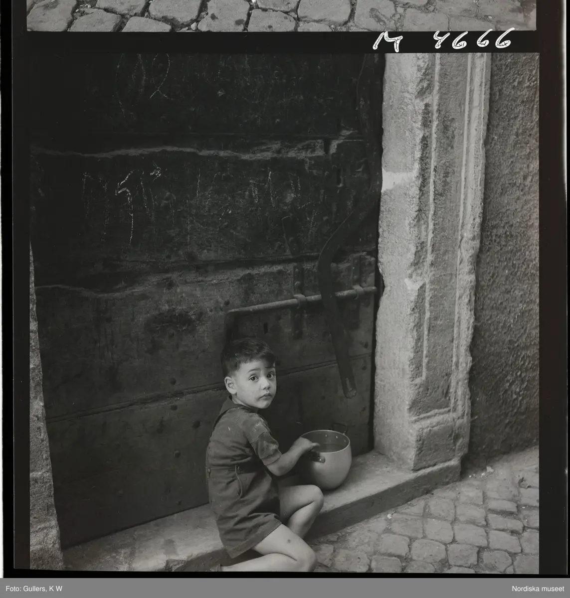 1717/B Rom. En pojke med en kastrull sitter på gatan framför en port.