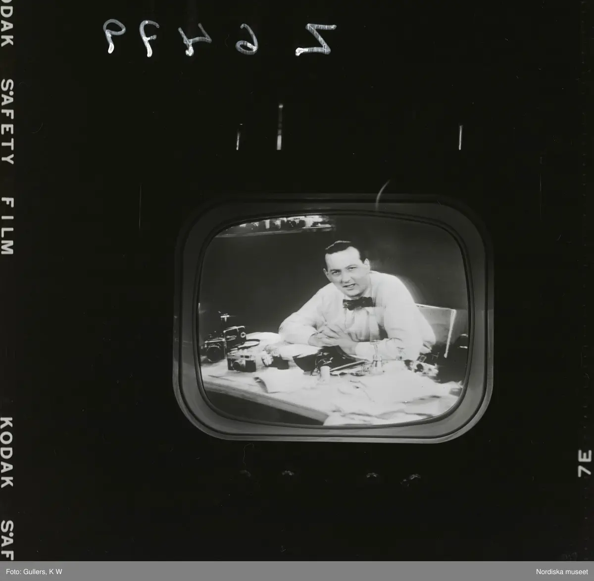 2429 Television Tak för TV; Sändning; Från utsändn. T-V-Studion + KWG på TV . Fotograf K W Gullers i TV-studio vid inspelning av fotografi-kurs. "Gullers fotokurs"