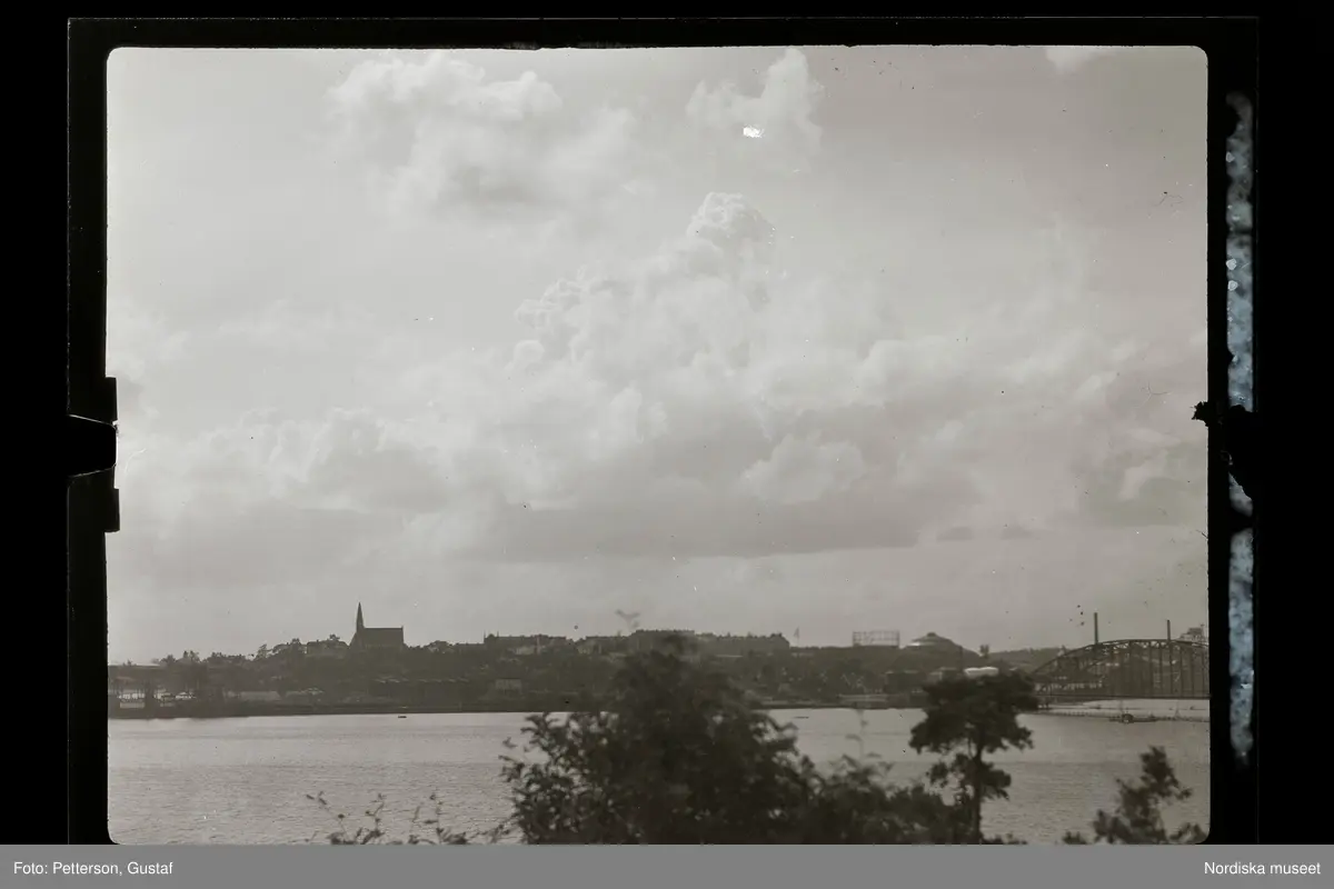 Vy över vattnet från Lidingö mot Hjorthagen med kyrkan och gasklockorna.