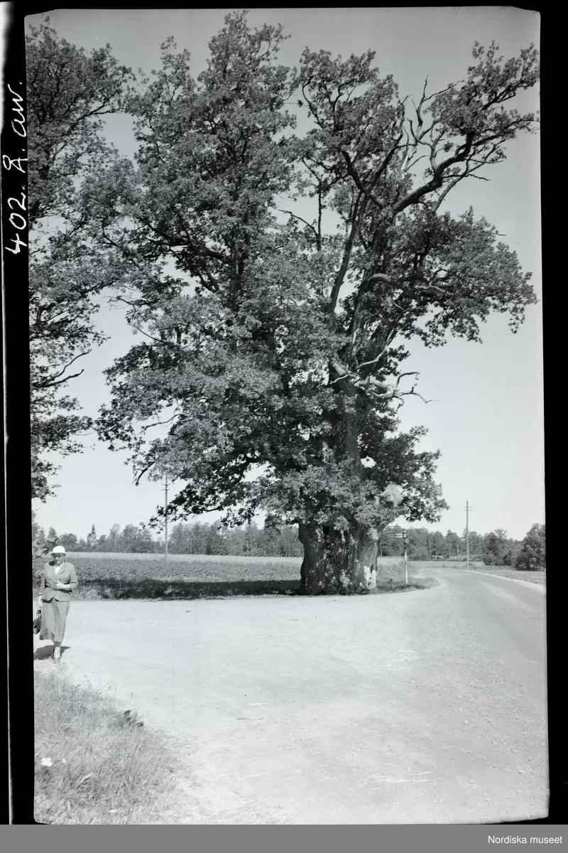 Träd i en landsvägskorsning. Vägskylt mot Borås. En kvinna går på vägen.