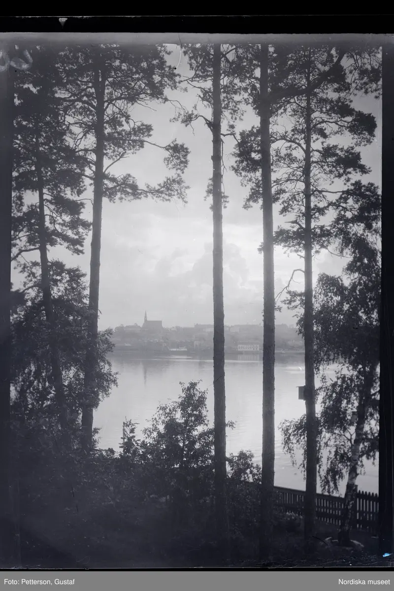 Vy mellan tallar, från Lidingö mot Hjorthagen och kyrkan.