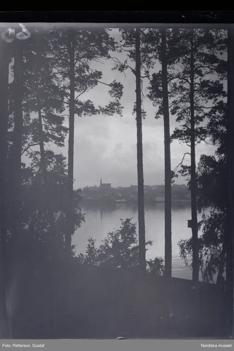Vy mellan tallar, från Lidingö mot Hjorthagen och kyrkan.