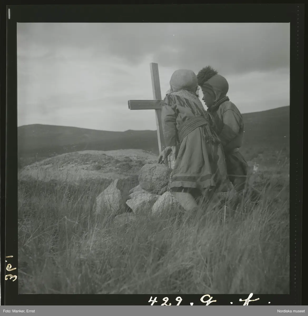 Barn läser inskription på gravkors. Vousko, Jukkasjärvi sn.