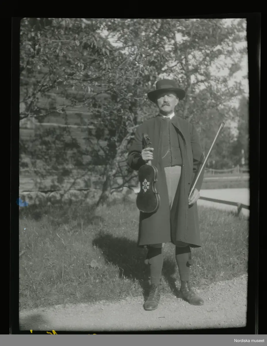 Man i folkdräkt med fiol. Skansen, Stockholm.