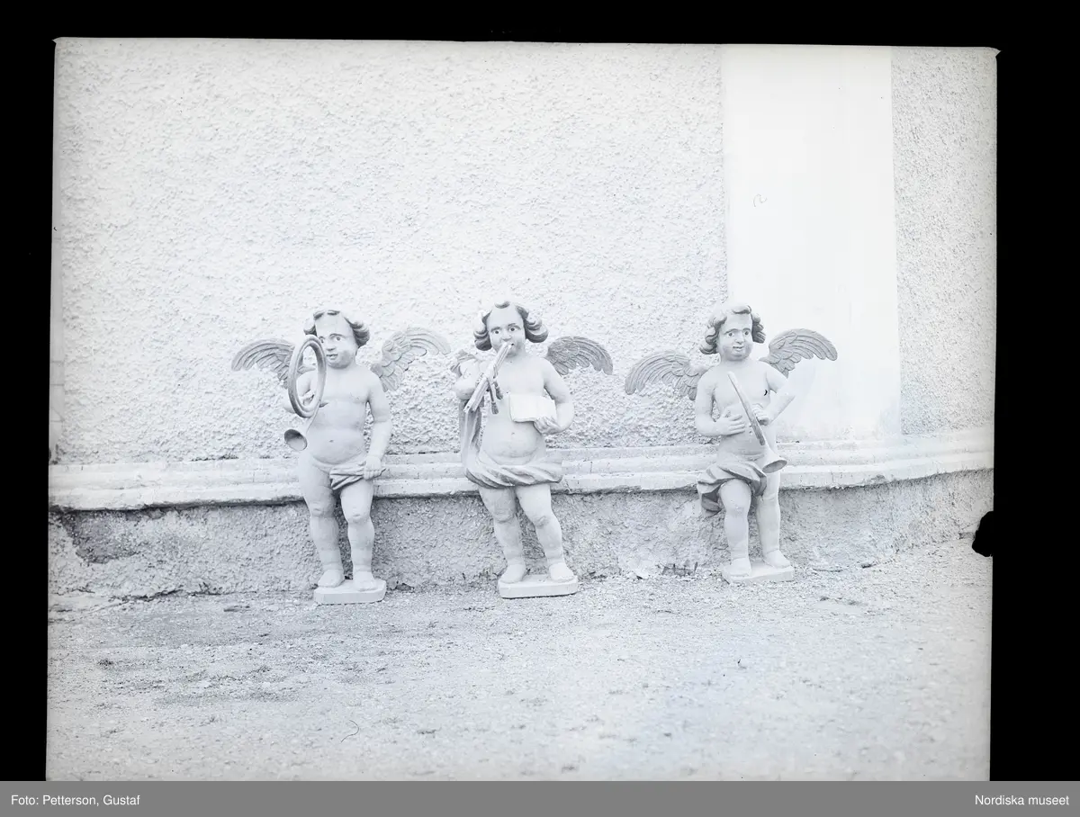 Tre stycken putti-/ ängelskulpturer med varsitt blåsinstrument.