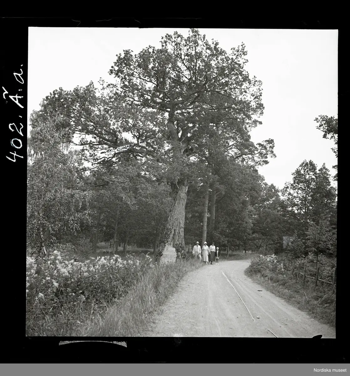 En man, två kvinnor och ett barn står på en grusväg intill en ek vars hålighet i stammen fyllts igen.
