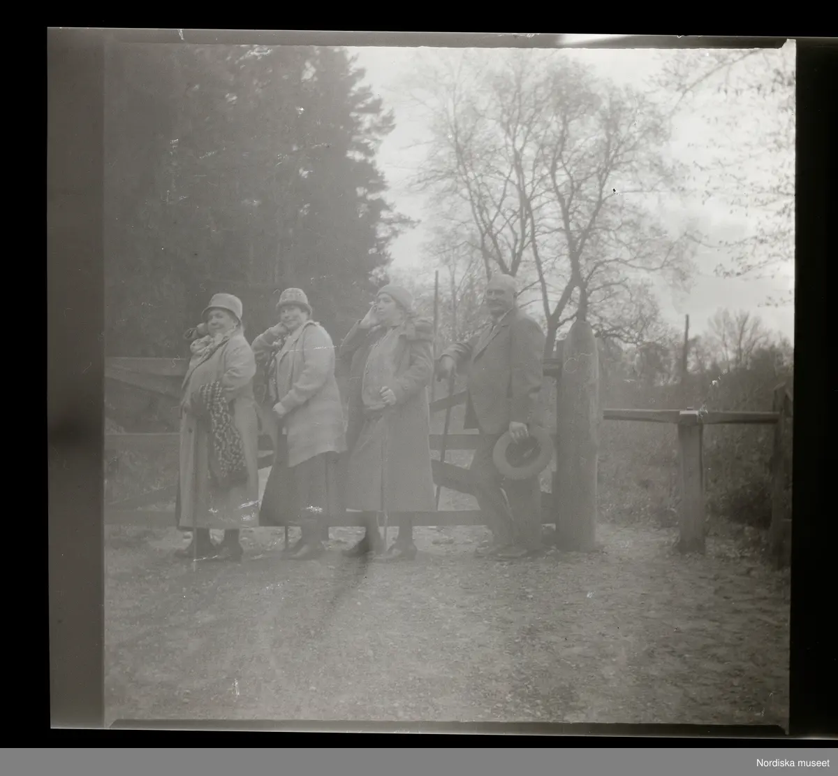 Tre kvinnor och en man poserar ståendes vid en grind.