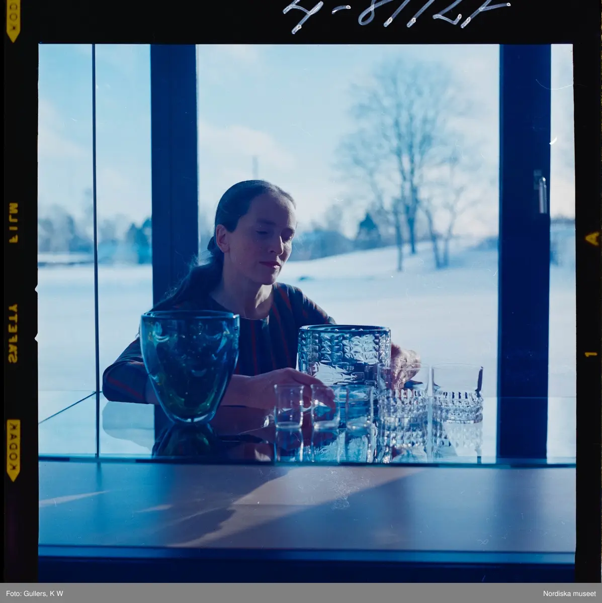 1713 Orrefors Glasbruk Ingeborg Lundin. Porträtt med formgivna glasföremål.