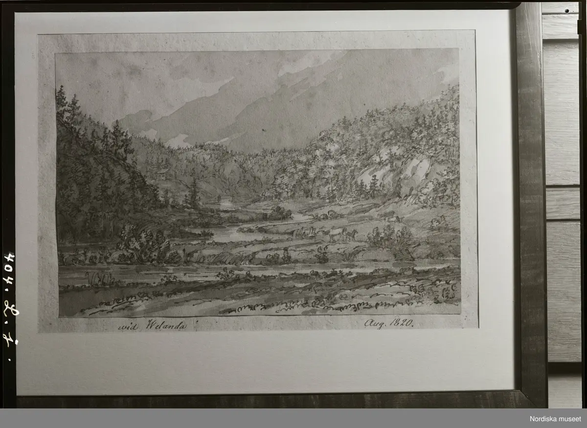 Foto av laverad teckning/grafik föreställandes ett bergigt landskap "wid Welanda, aug. 1820".