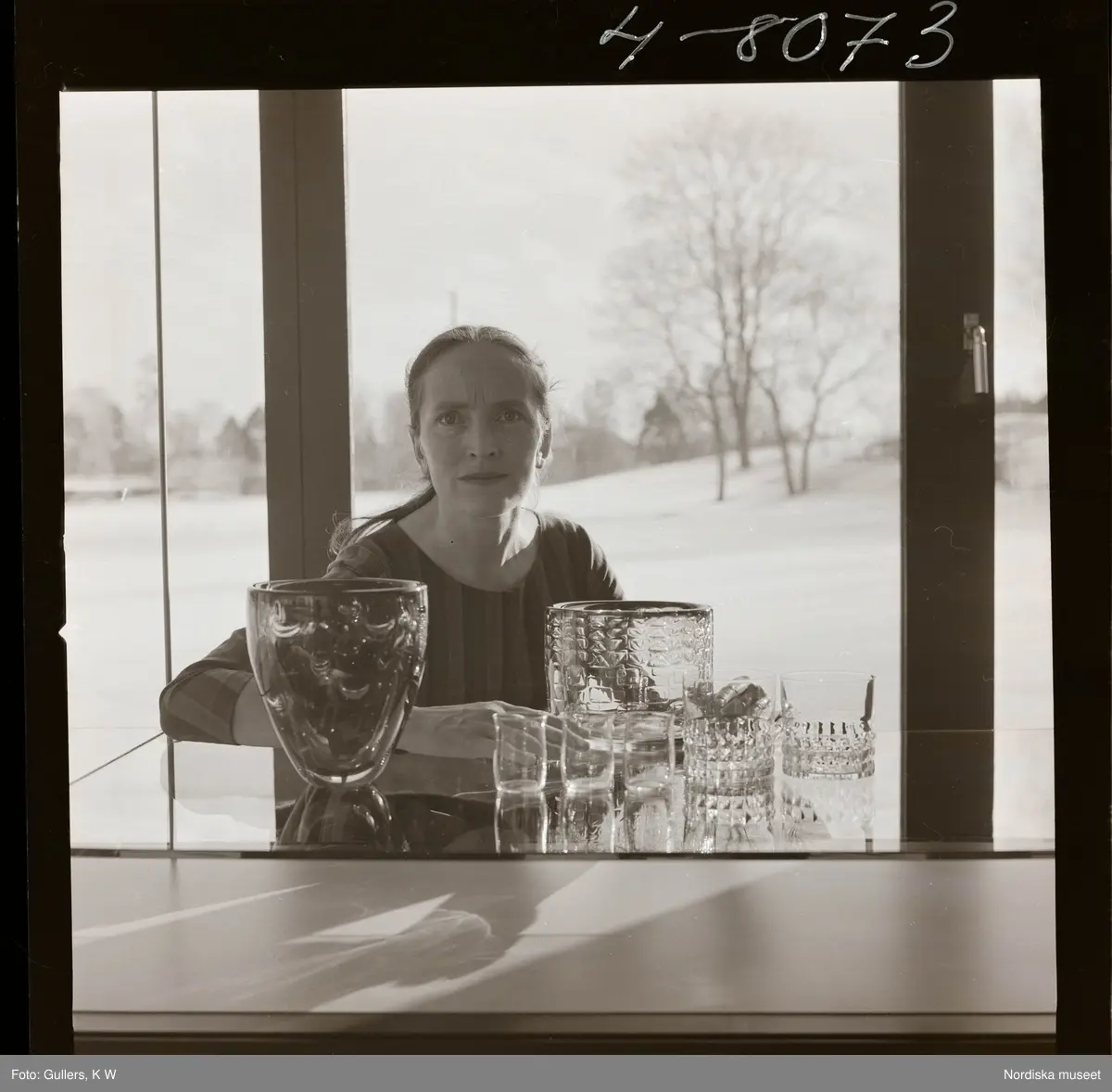 1713 Orrefors Glasbruk Ingeborg Lundin. Porträtt med egenformgivna glasföremål.