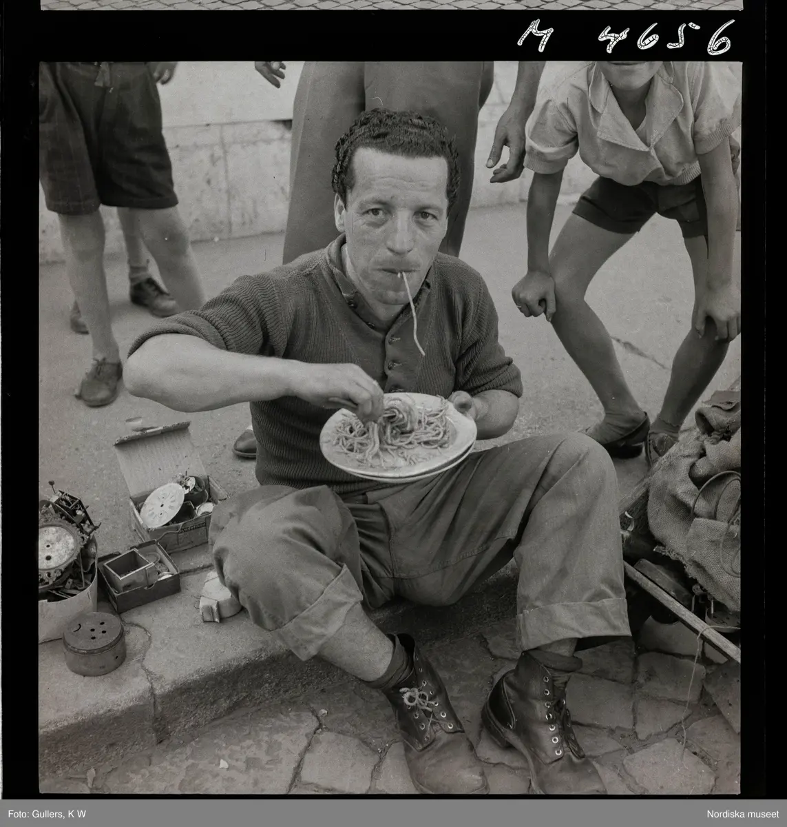 1717/B Rom. En man äter spagetti sittandes på trottoaren.