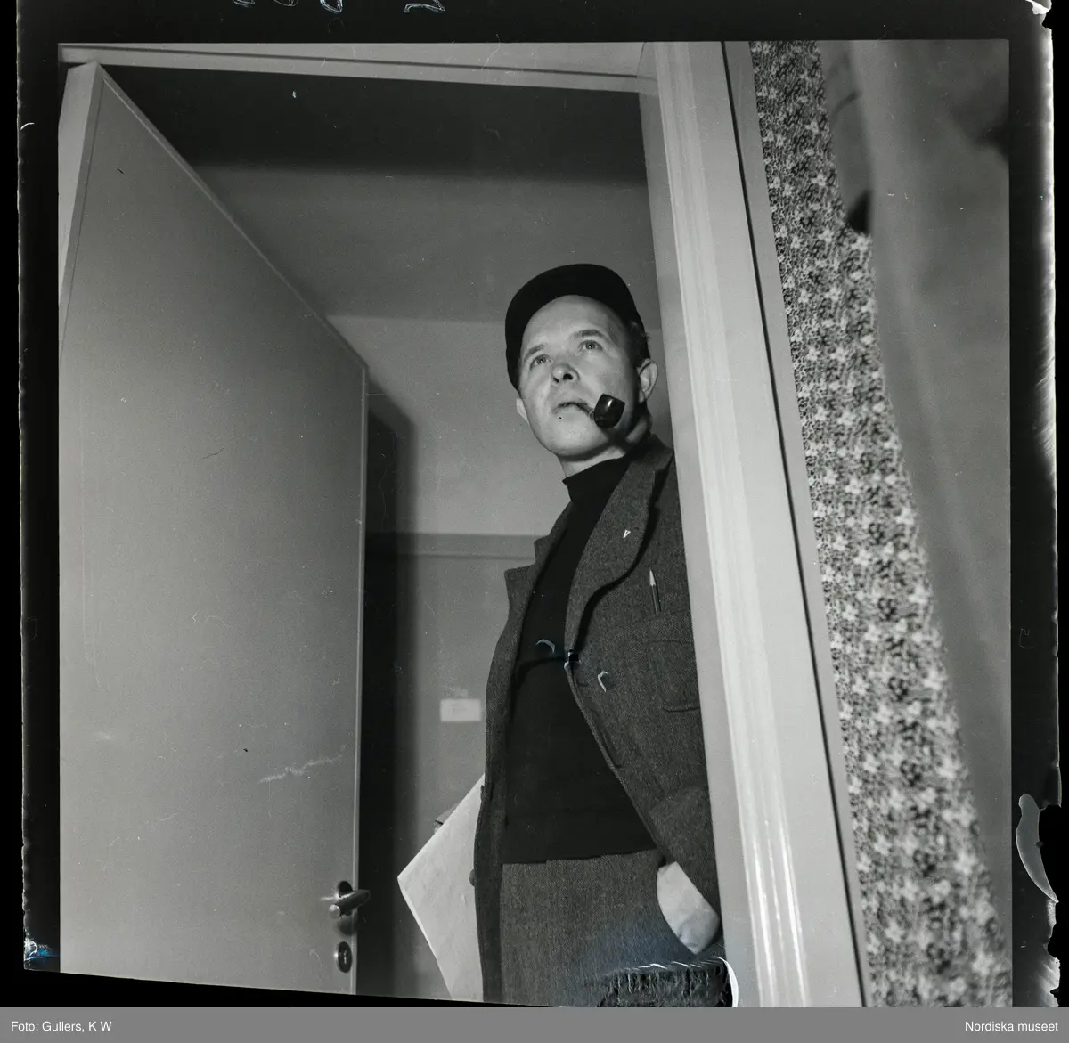584 Brunsviks Folkhögskola. Ragnar Netzén står i en dörröppning och röker pipa.