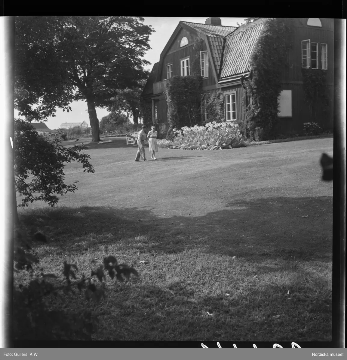 507 B Ultuna. Ett par går på gräsmattan framför ett hus..