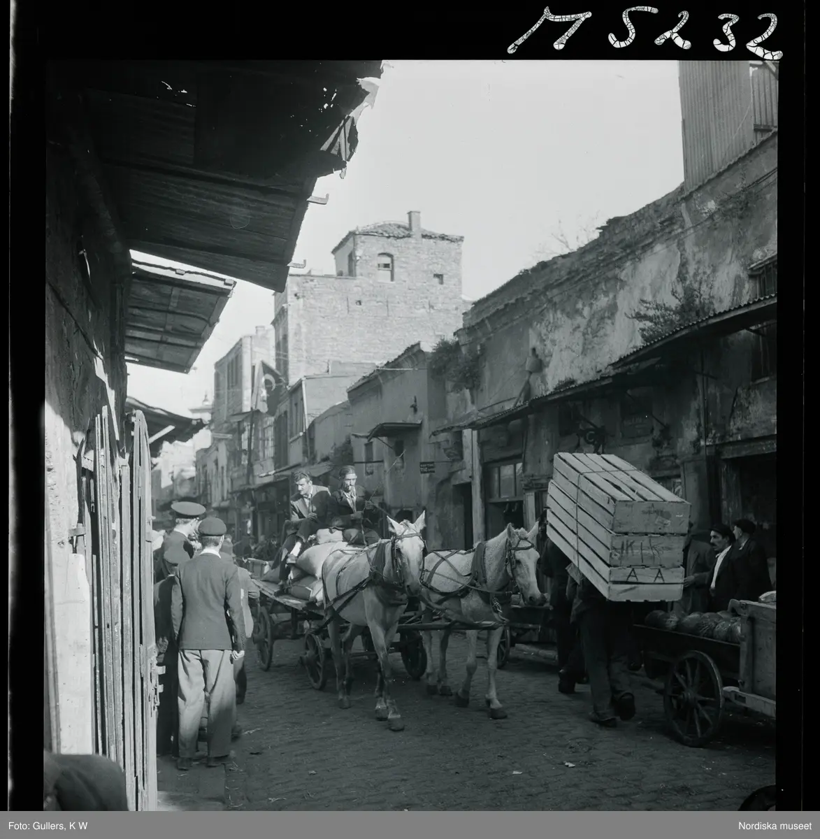 1717/K Istanbul allmänt. Gatuliv. Transport av varor med hästar och vagn, män som bär på ryggen.