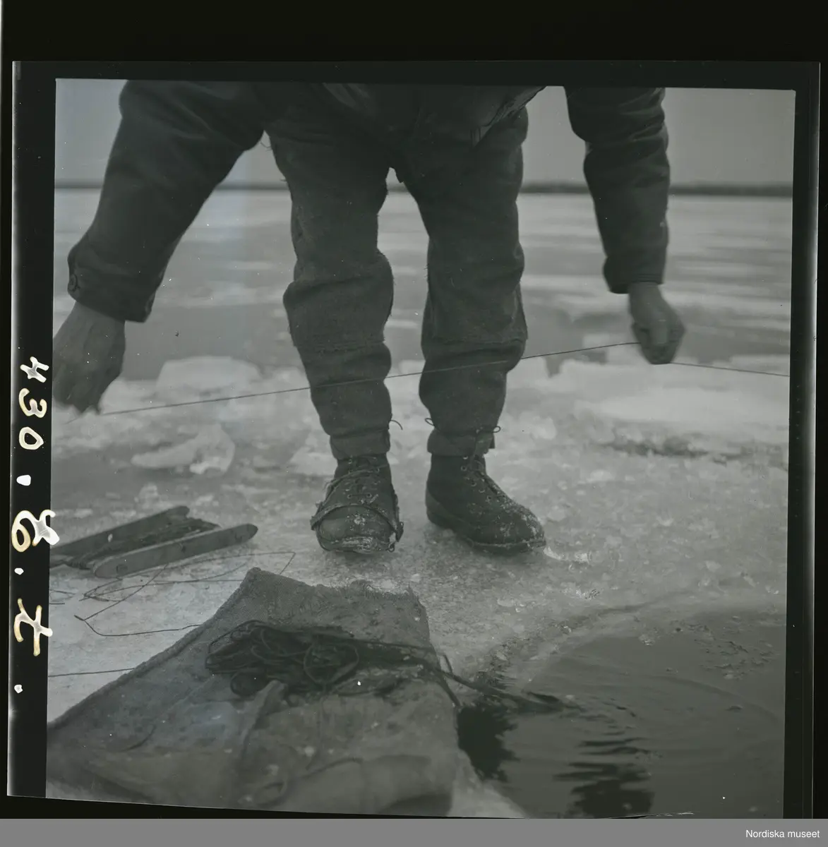 Vinterfiske på sjön. Det fiskas genom hål i isen.