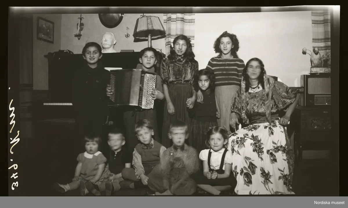 Porträtt av en grupp barn. En pojke spelar på ett dragspel.