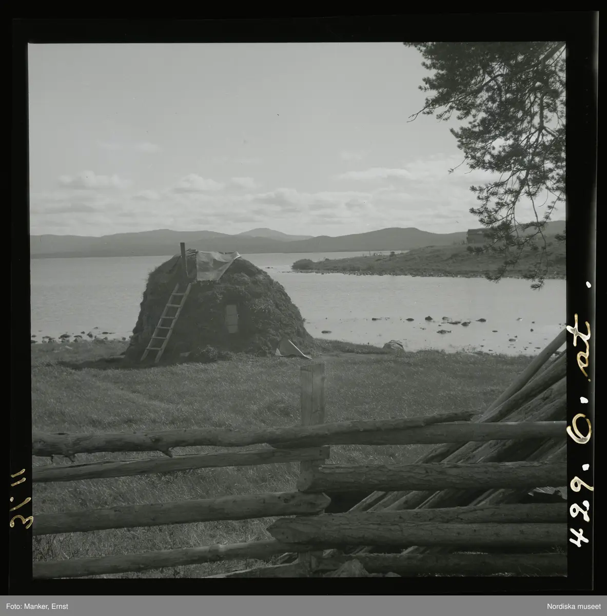 Torvkåta invid vatten. En stege står lutad mot kåtan.
