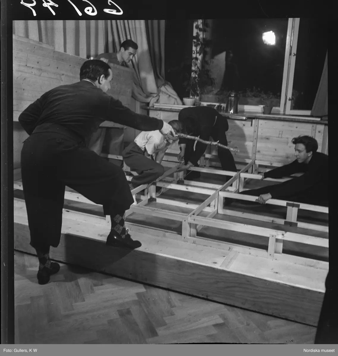 505 Wityansky Teaterskola för Allers. Scenbygge. En man instruerar och pekar med en käpp.