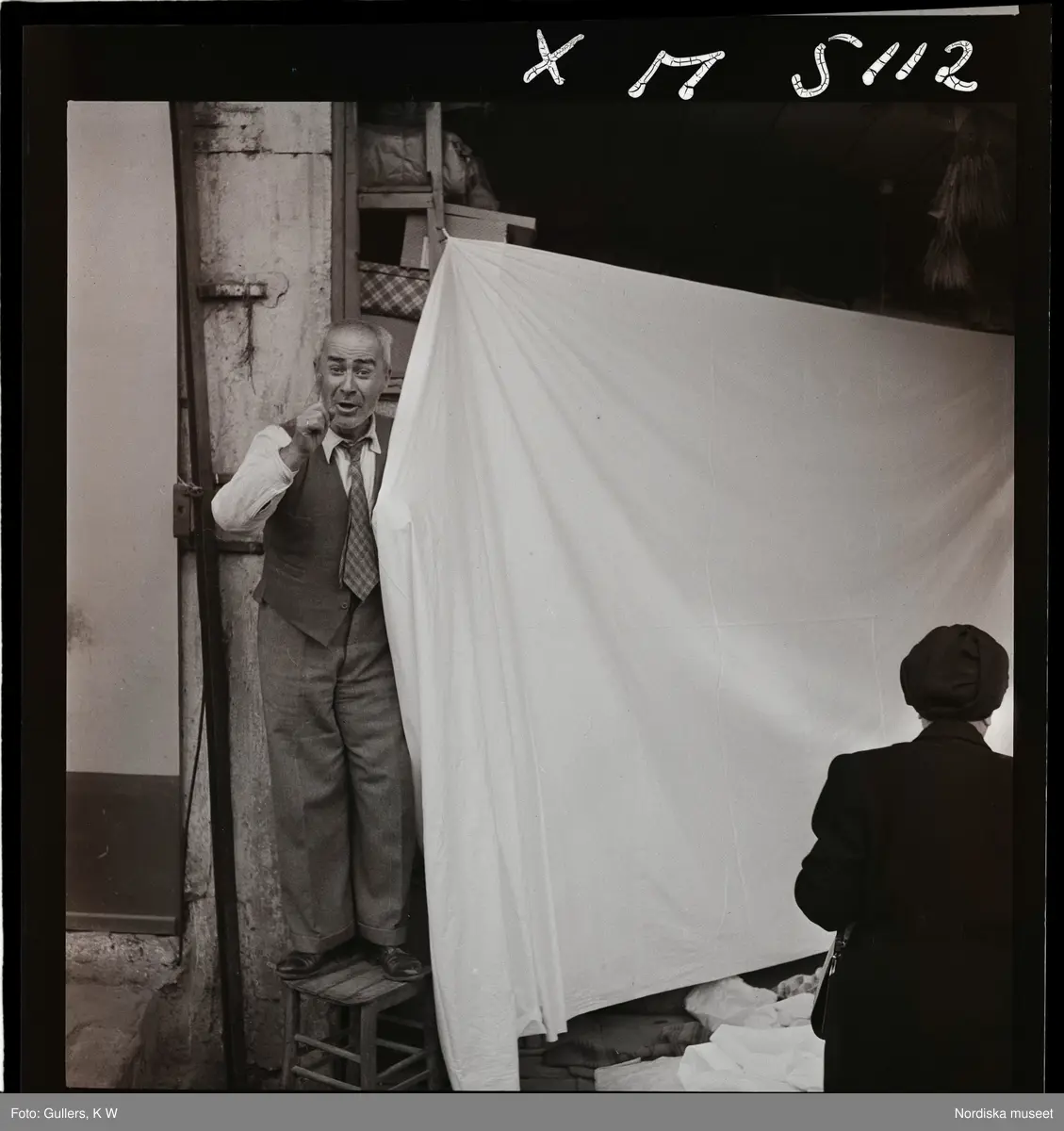 1717/L Istanbul allmänt. En man står på en pall och spänner upp ett vitt tyg framför ingången till en butik.