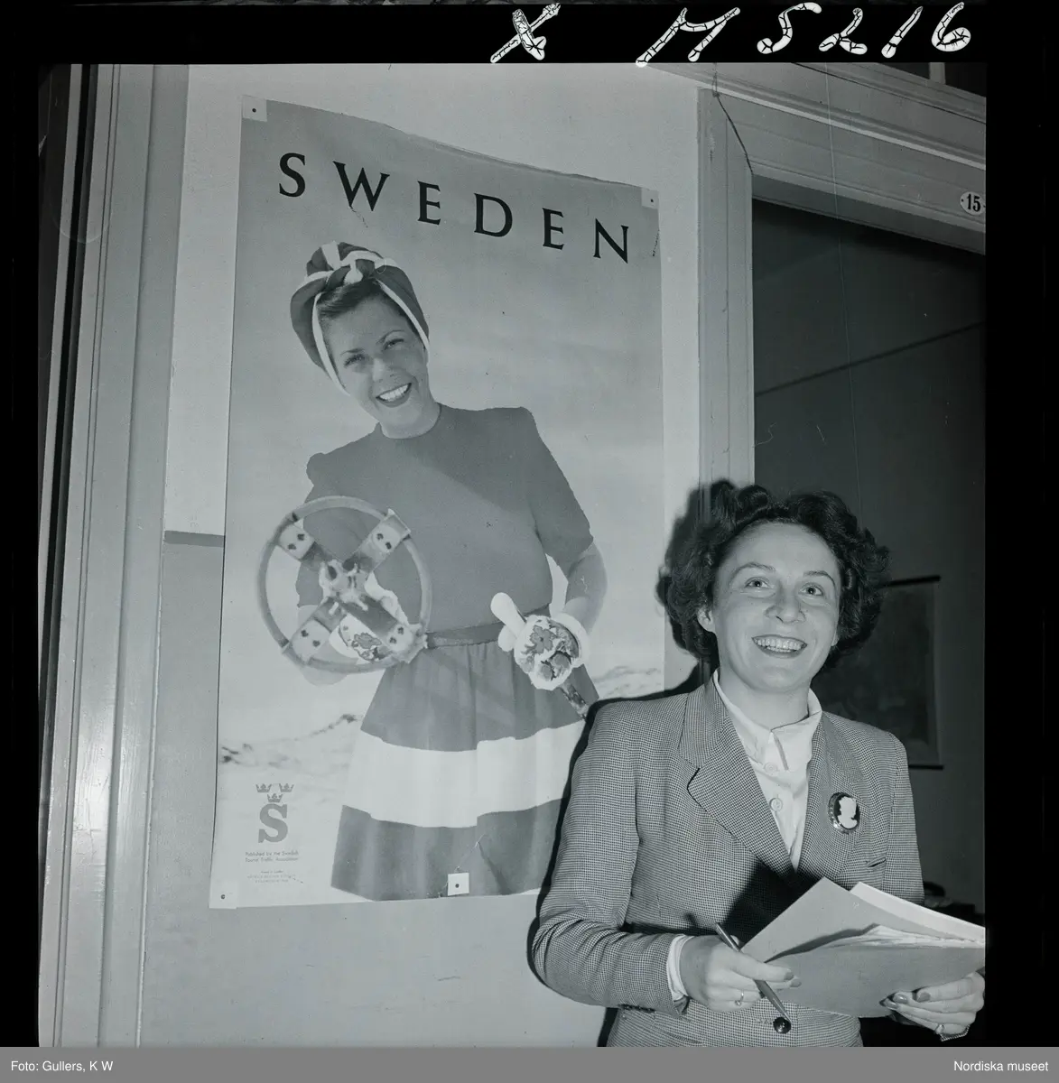1717/K Istanbul allmänt. En leende kvinna med papper i händerna står framför en affisch som gör reklam för Sweden.