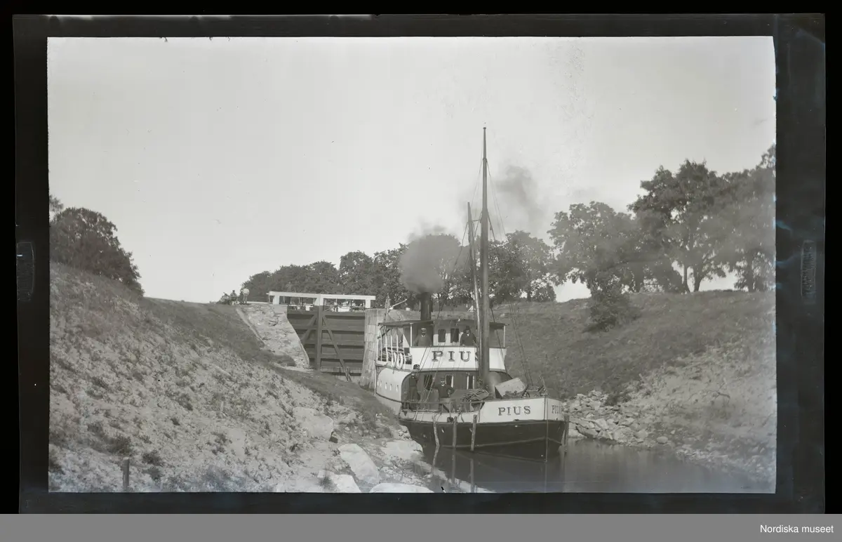 Ångfartyget S/S Pius passerar en sluss i en kanal (Strömsholms?).