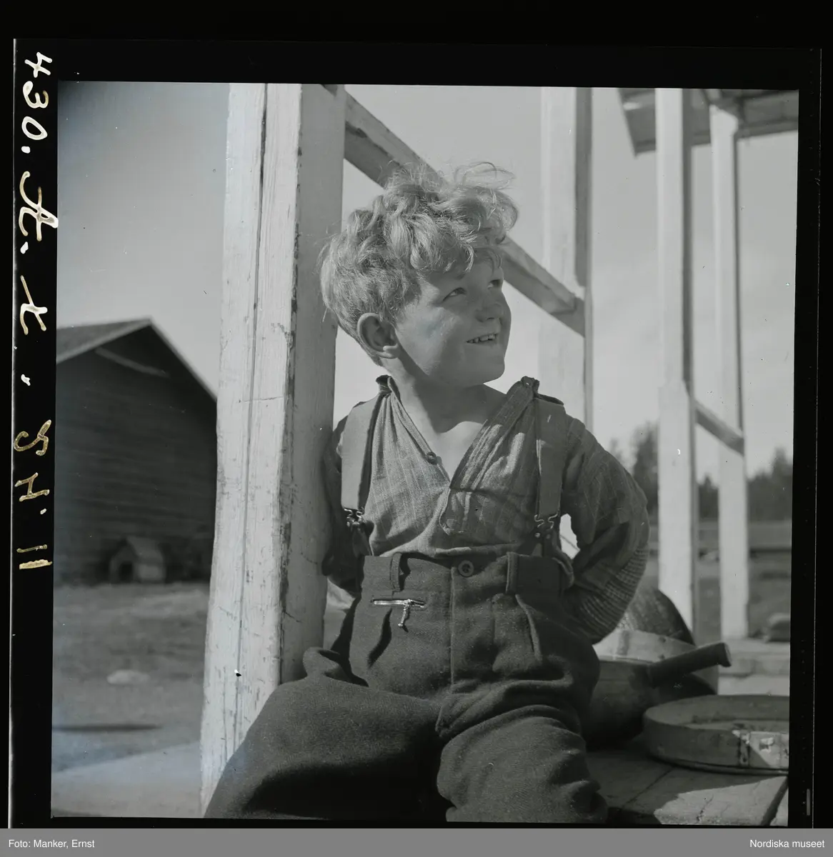 Per Arne, f. 1935. En pojke sitter på farstubro. På byordningsmannen Frans Perssons gård i Purnu, Gällivare skogssameby.