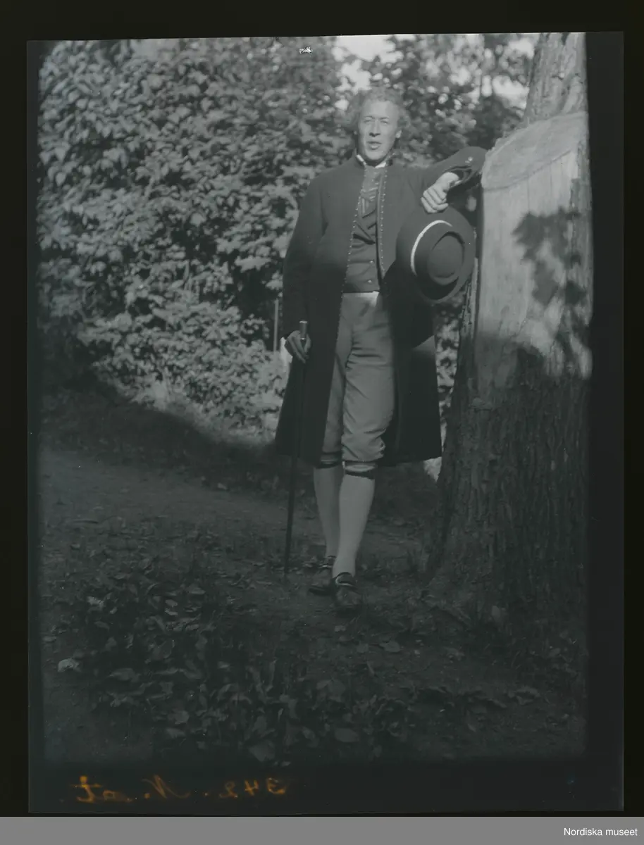 Porträtt av man i folkdräkt med käpp och hatten i hand. Skansen, Stockholm.
