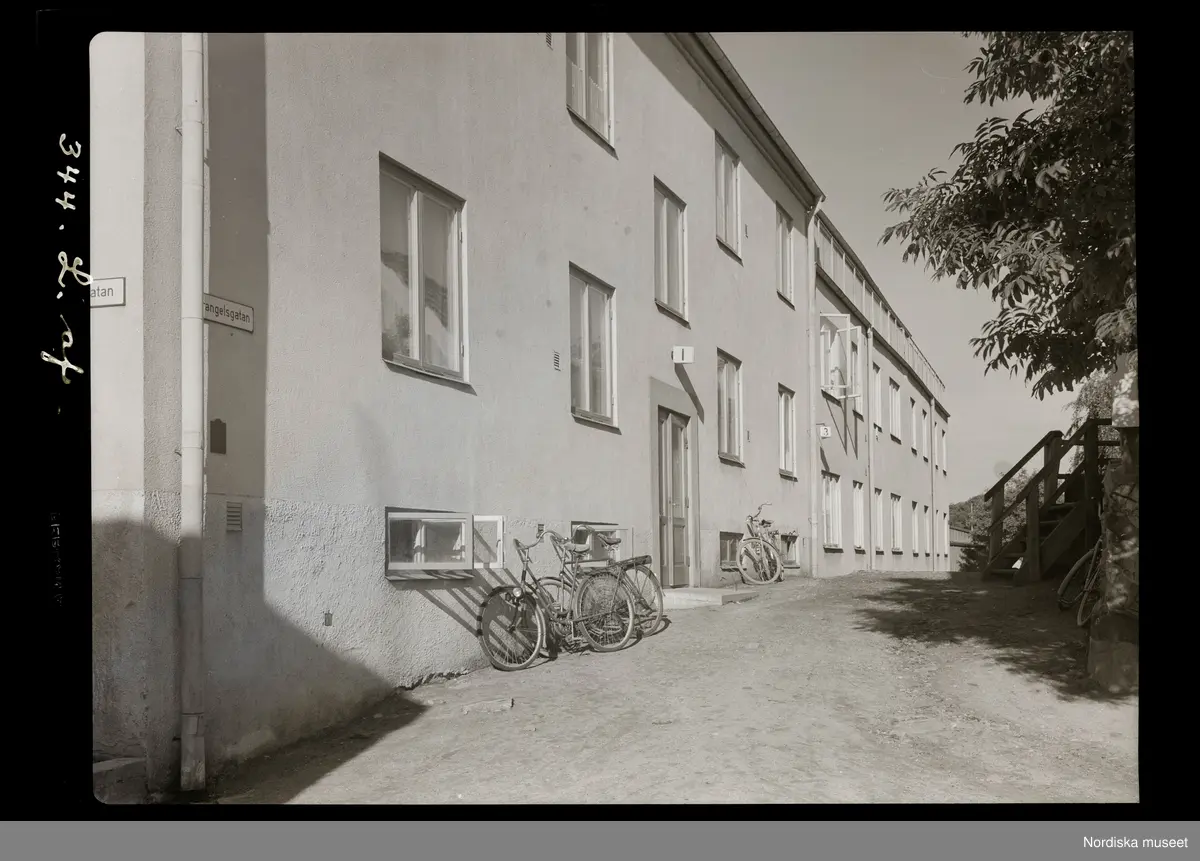Cyklar parkerade utanför porten till flerfamiljhus på Wrangelsgatan 1. Björkholmen, Karlskrona.