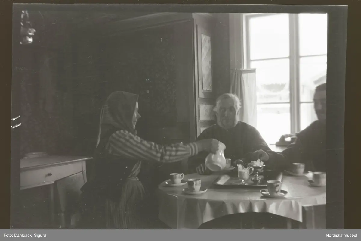 Fotografens anteckning: Kaffebordet i dito (August Holmströms) gård med samma personer (August Holmström, Carin Holmström, Gottfrid Pettersson).