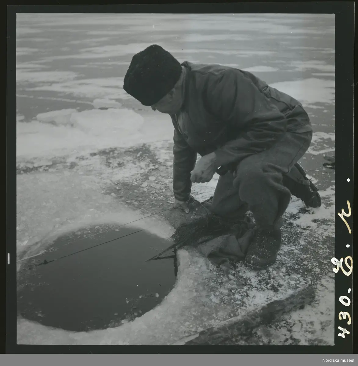 Vinterfiske på sjön. Det fiskas genom hål i isen.