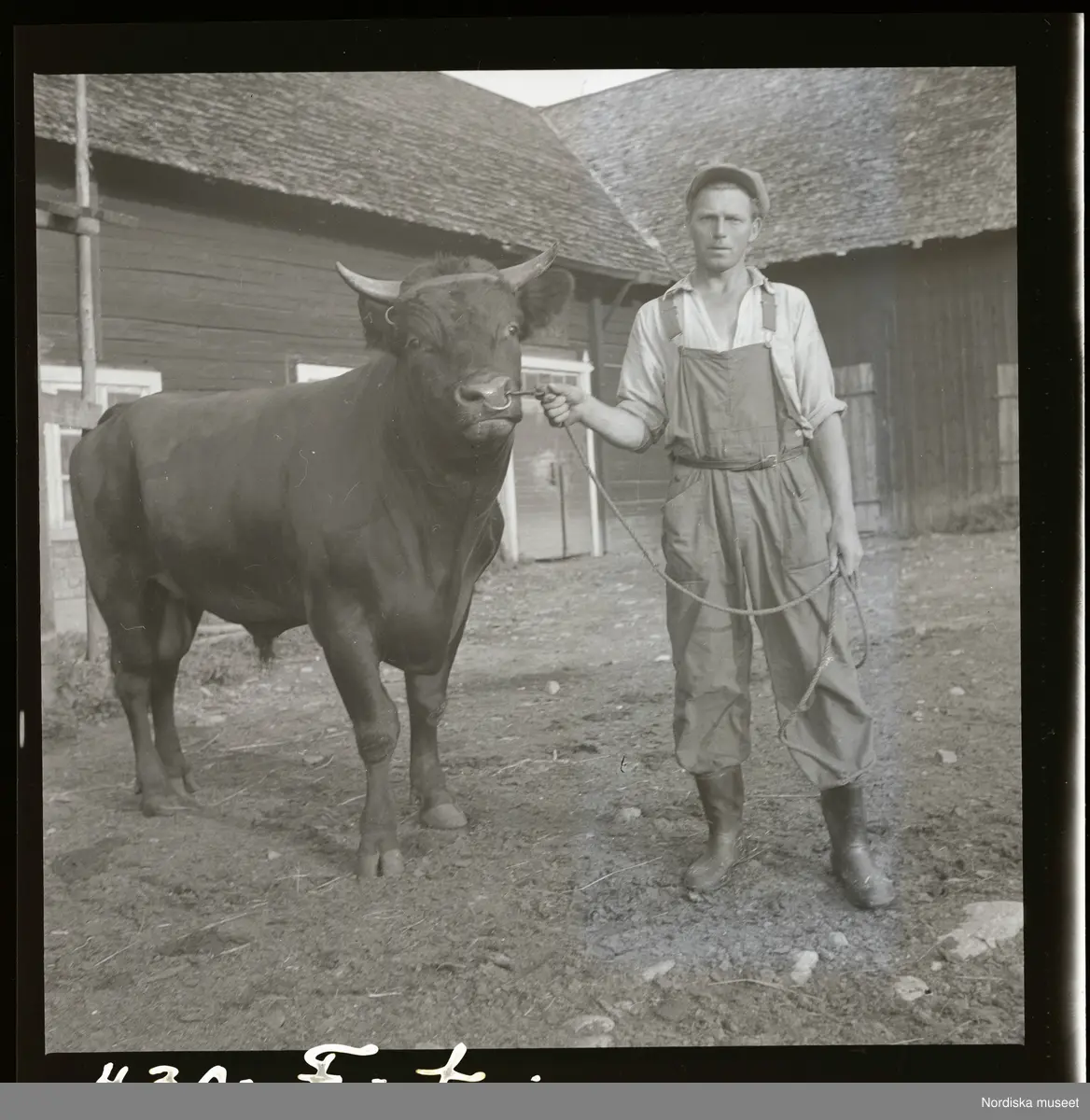 En man står på en gårdsplan och håller en tjur som har ett rep fäst i nosringen.