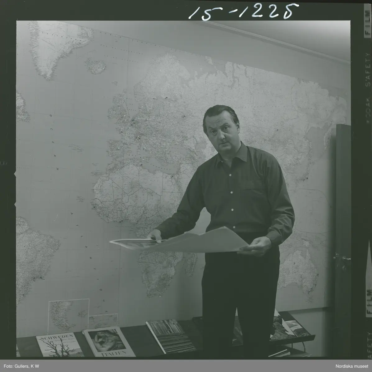 Fotograf K W Gullers står framför en stor väggkarta och håller en fotoprint.