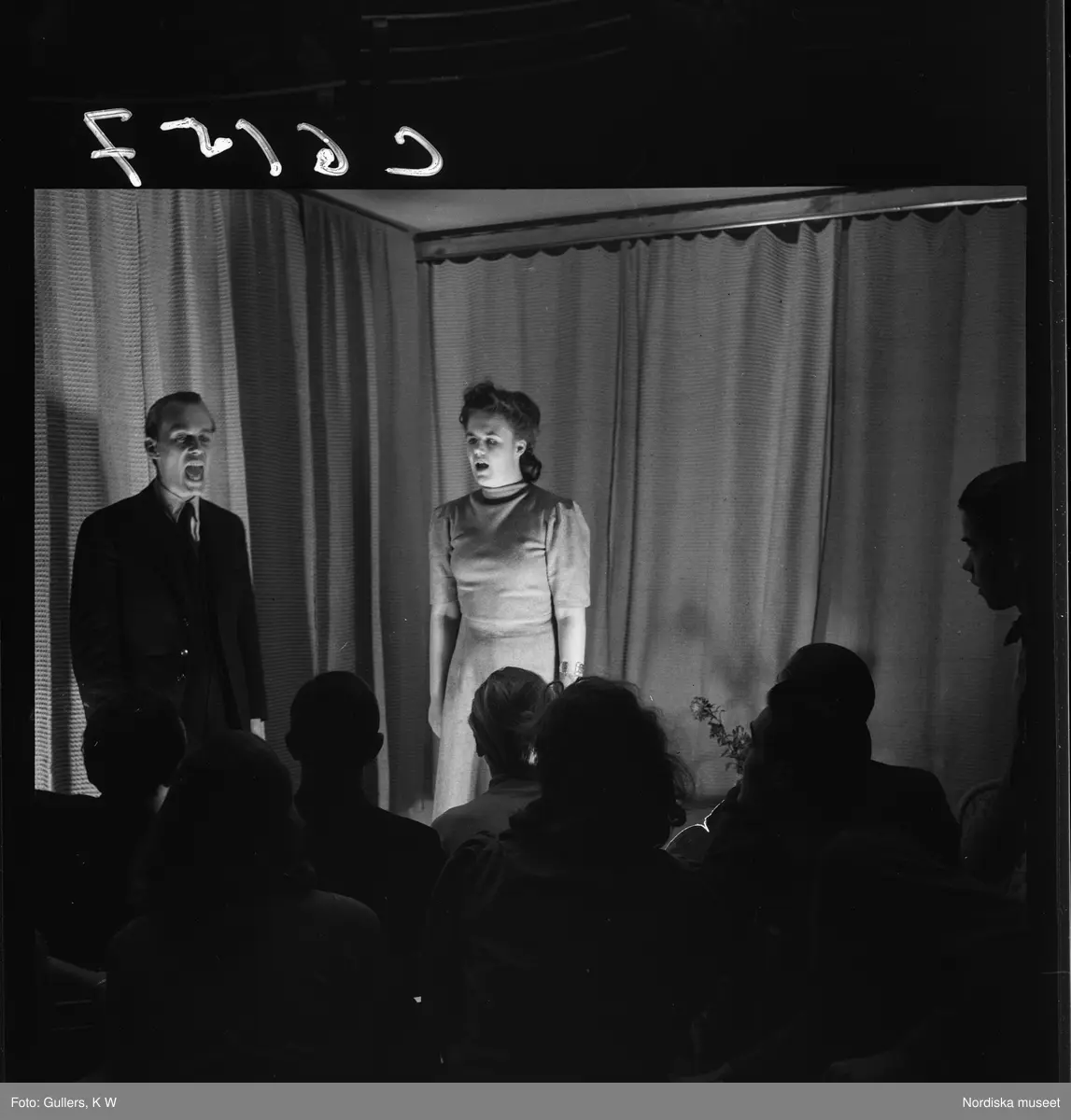 505 Wityansky Teaterskola för Allers. En manlig och en kvinnlig elev på scen, publik framför.