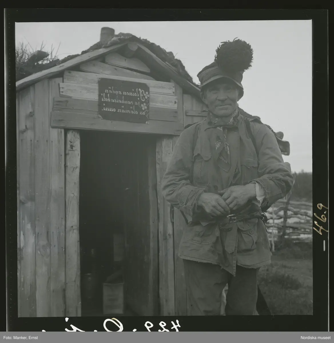 En samisk man framför sin bostad. Ovan dörren hänger en handmålad tavla med finsk text: "Iloinen sydän ja rauhaisakoti on elämän onni"