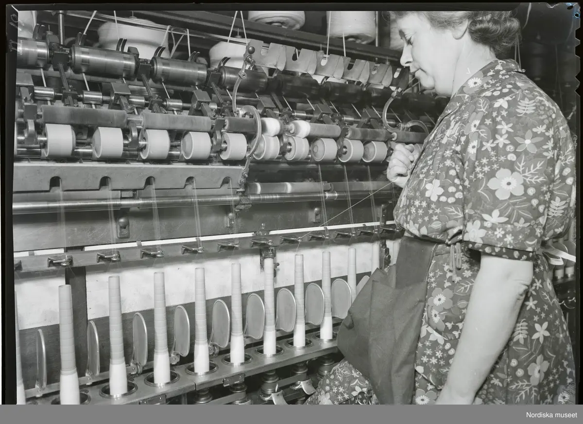 Titel: Textilindustri. En kvinna arbetar vid en vävmaskin. Dokumentation av Slitmanfabriken ABs verksamhet.