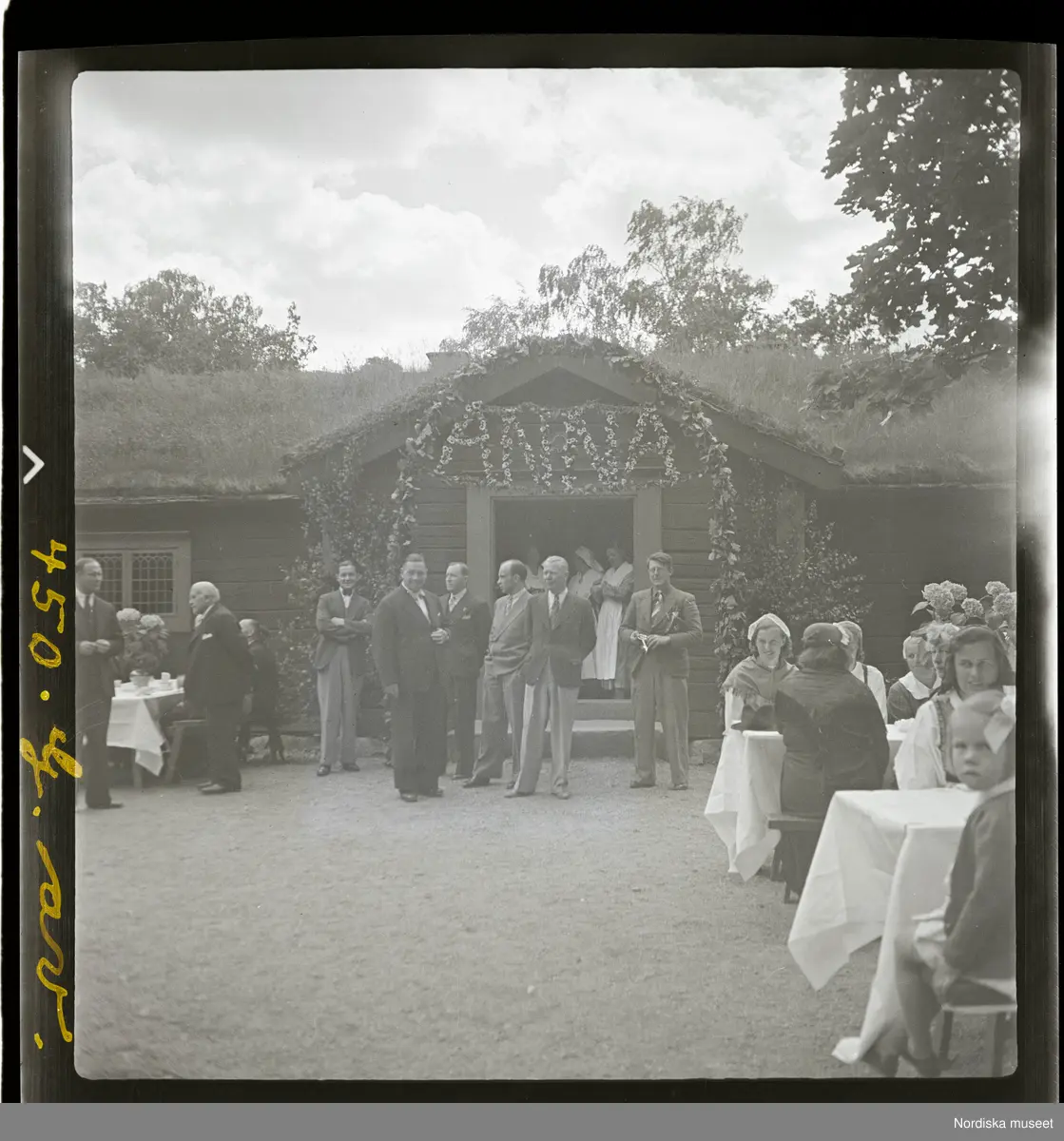 Människor under festligheter på gårdsplanen framför ett hus. En dekoration i blommor stavar "Anna" ovanför dörren. Skansen, Stockholm.