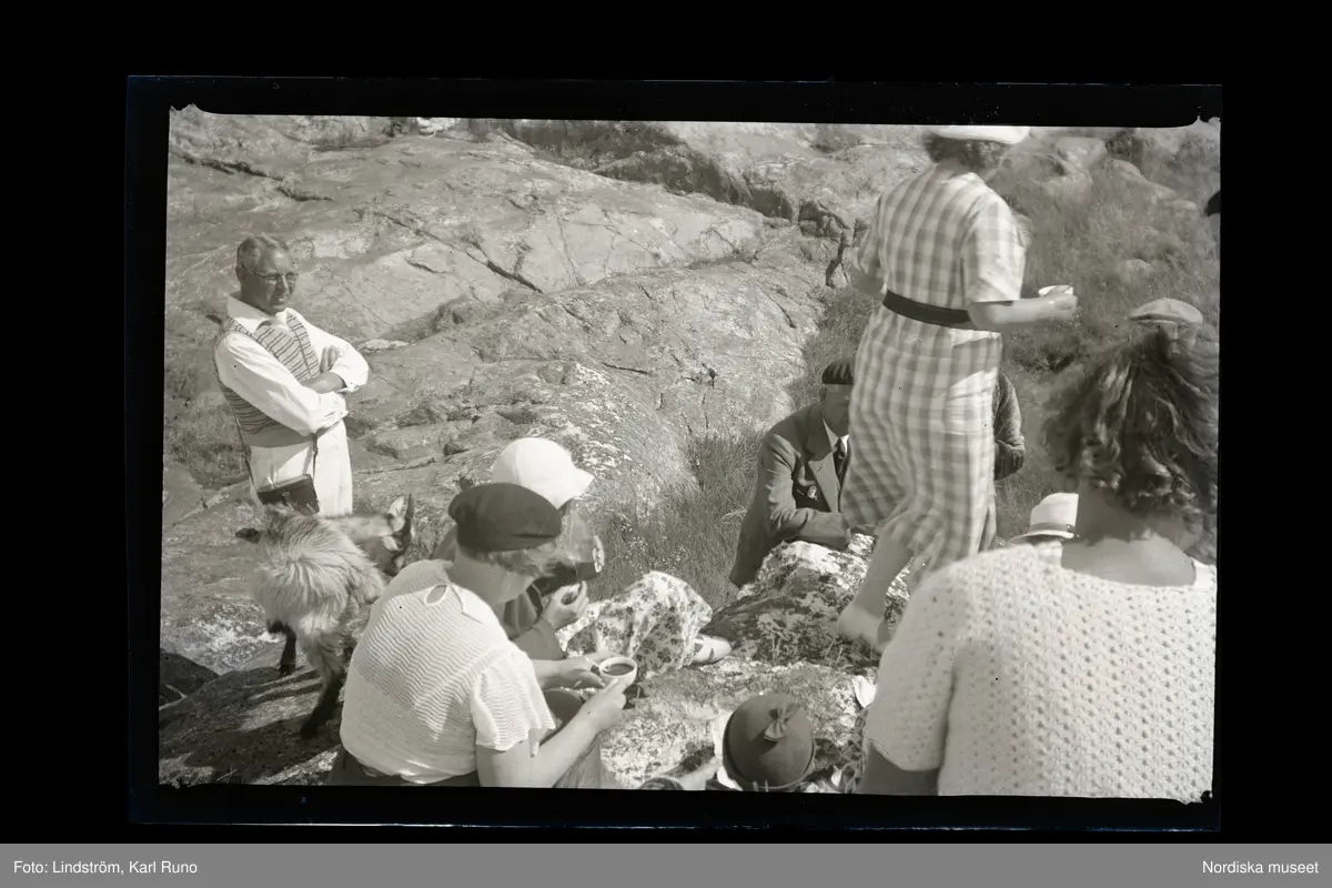 Ett sällskap dricker kaffe på klippor vid en utflykt.