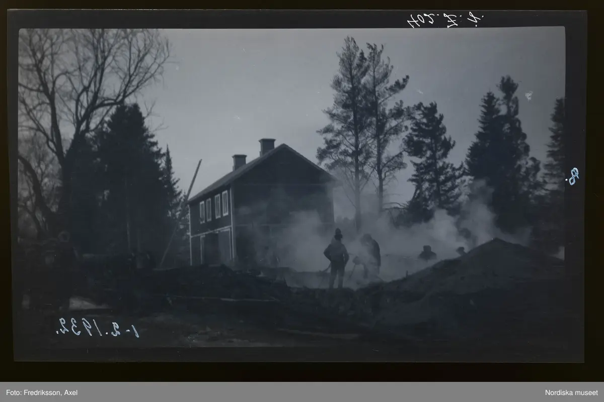 Några män vid en rykande hög på marken. 1 februari 1932.