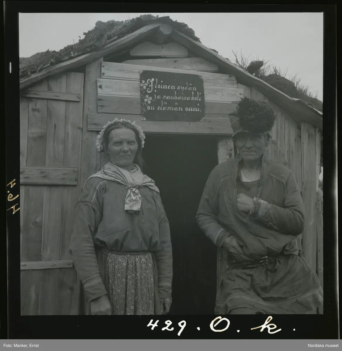 En samiskt par framför sin bostad. Ovan dörren hänger en handmålad tavla med finsk text: "Iloinen sydän ja rauhaisakoti on elämän onni"