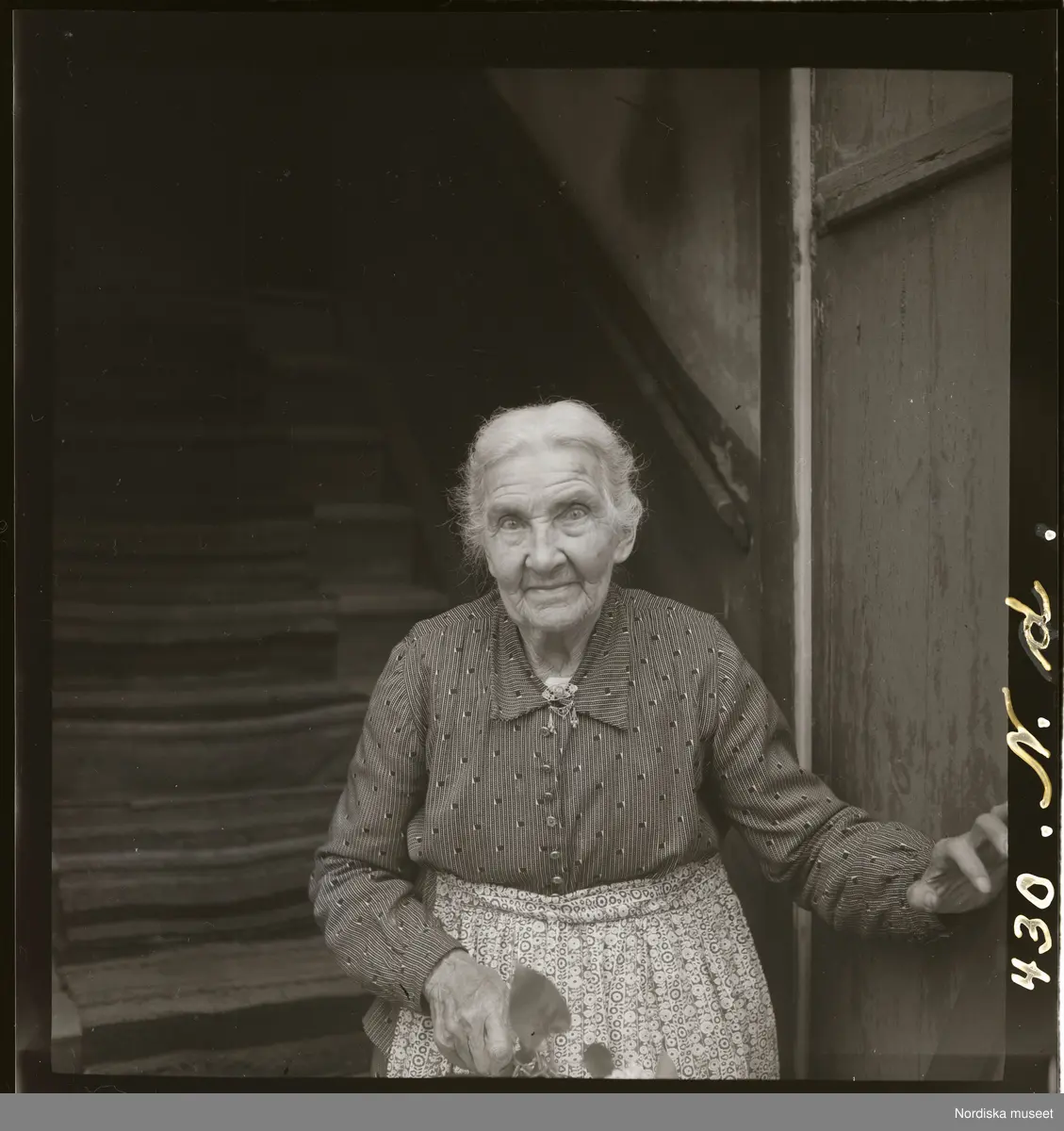 Porträtt av en äldre kvinna ståendes i dörren in till ett trapphus.