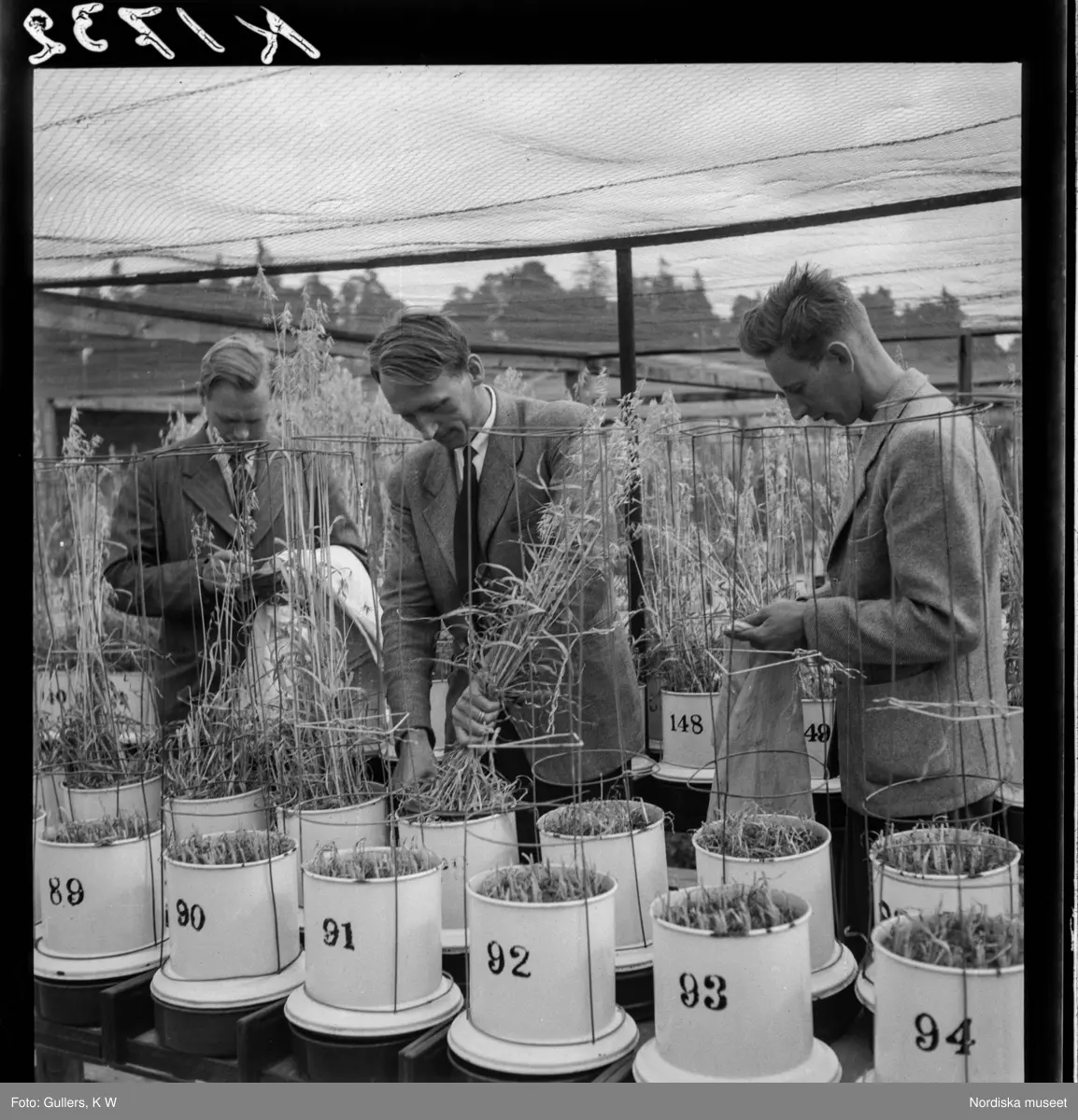 507 B Ultuna. Tre män inspekterar grödor drivna i kruka.