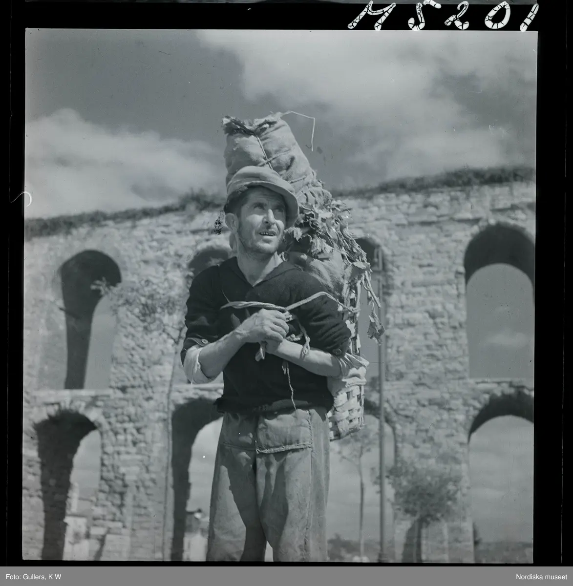 1717/K Istanbul allmänt. En man som bär en korg på ryggen. I bakgrunden en akvedukt.