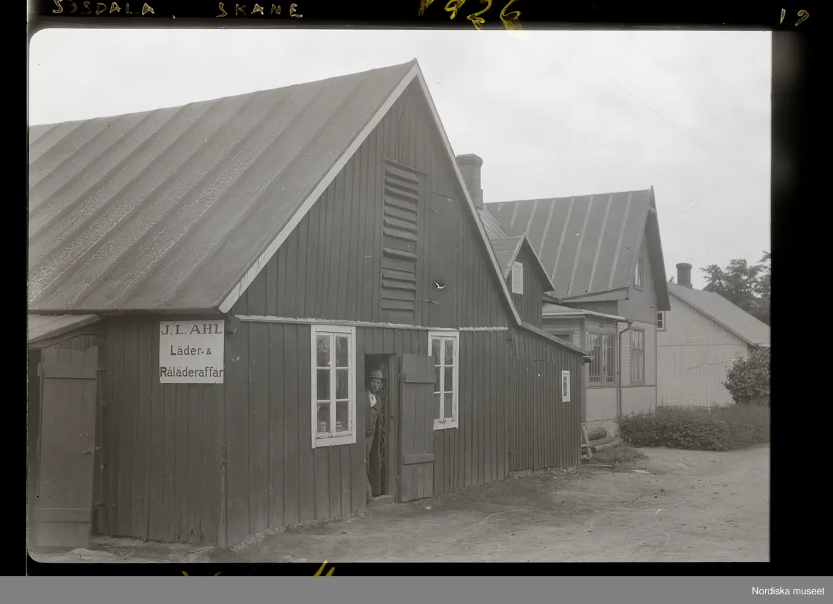 Man i dörröppning till byggnad med skylt: J.L. Ahl. Läder- & Råläderaffär.