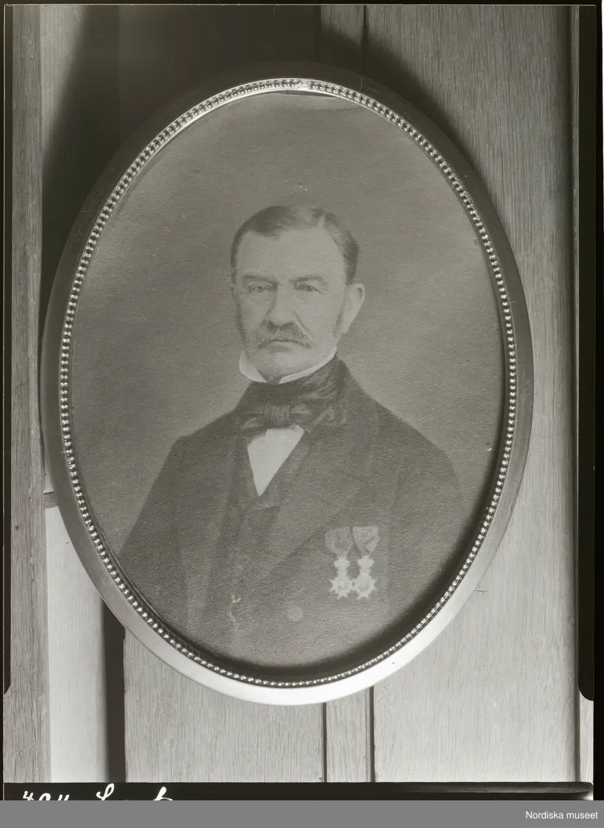 Foto av inramat porträttfotografi. Man med medaljer på bröstet.