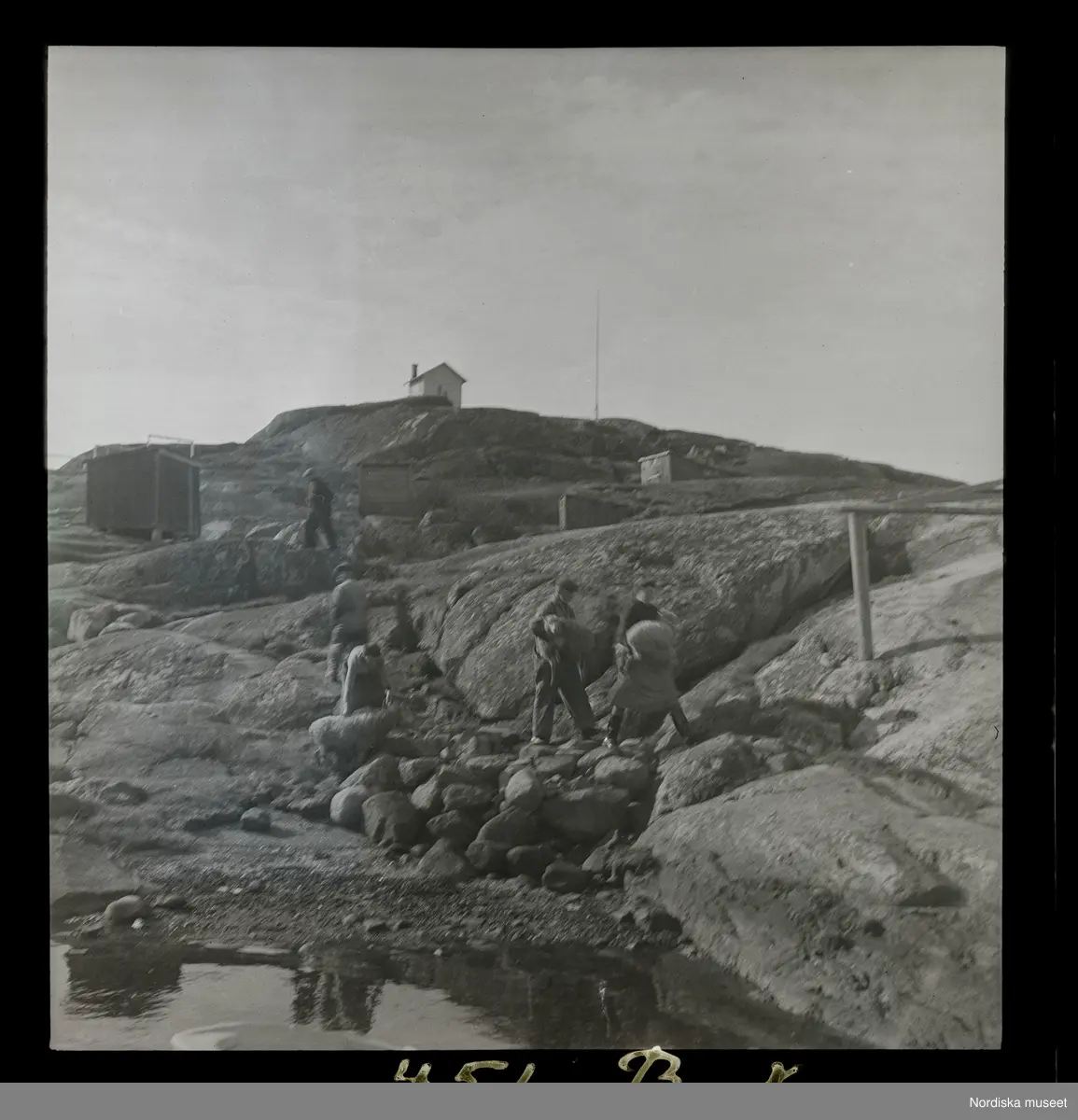 Vägen från Rollofes (Karl Olssons gård) ner till Sniken är brant och stenig. Fåren bärs en stor del av vägen av sönerna Algot och Albert och deras fruar. Överst på berget gamla lots-utkiken.