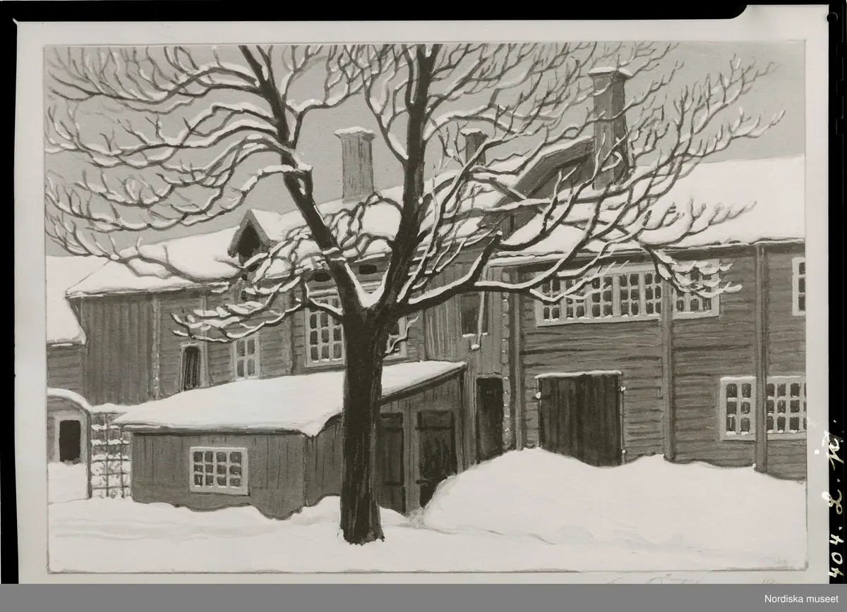 Målning föreställandes träd och hus i snö, utförd av Sven Östbom 1927.