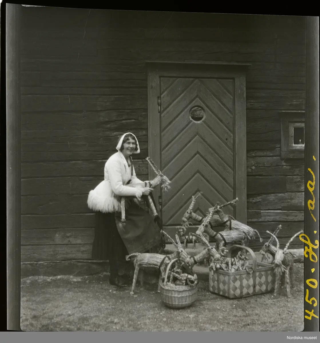 Titel: Kvinna med halmbockar tillverkade för försäljning på Skansens julmarknad. Skansen, Stockholm.